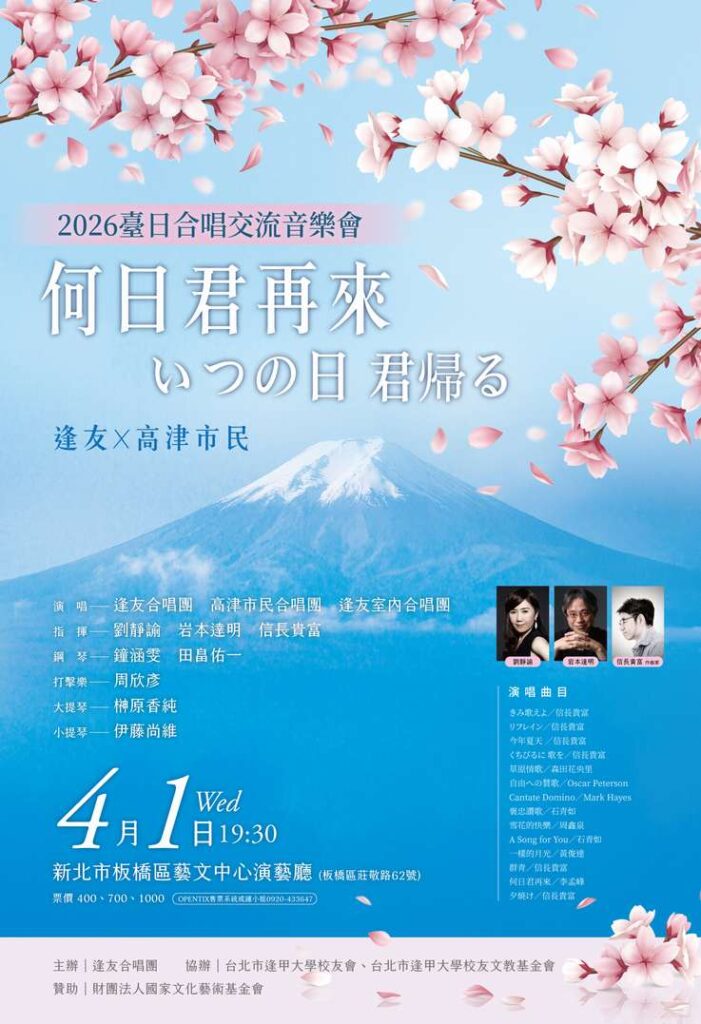 作曲家・信長貴富さんと行く台湾演奏旅行!! その他 2025.08.302026.02.26 高津市民合唱団では2026年春に台湾演奏旅行を計画しています。当初は5年前に実施する予定でしたが、世界的コロナ蔓延の影響で延期していた企画で、指揮者・岩本達明氏と、台湾でも人気の作曲家・信長貴富さんとともに行く演奏旅行です。演奏曲は信長作品を中心に、混声合唱曲の『きみ歌えよ、リフレイン、ボクはウタ、くちびるに歌を、群青、他』を予定しています。