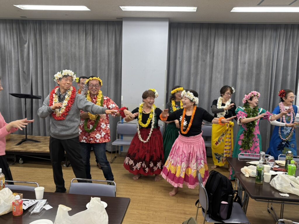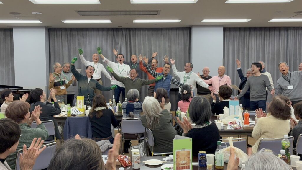 忘年会では、指揮者の岩本先生、ピアニストの田畠先生、団内指揮者の小杉さんから、今年たくさんのイベントに恵まれて楽しかったことや、来年、再来年に向けて元気の出るお話がありました。恒例のフラダンスを全員で踊り、今年初開催された神奈川男声合唱フェスティバルで演奏した男声合唱が披露され、熱演に盛り上がりました。また、今年定演で歌った「春」の場面をDVDで観て、目頭が熱くなった私たちでした。最後に「第九」Mの合唱で勢い付き、「ハレルヤ」を声高らかに歌い、来年への希望に満ちた忘年会になりました。
