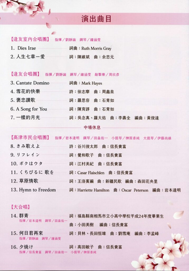 高津市民合唱団ステージでは6曲を、合同ステージでは、岩本先生、劉靜諭先生、信長貴富先生の指揮で3曲を演奏。そして会場の大きな拍手とアンコールに応え、再度「夕焼け」を歌いました。逢友合唱団の温かい歓迎と会場の「ブラボー」の声に胸を熱くした私たちでした。