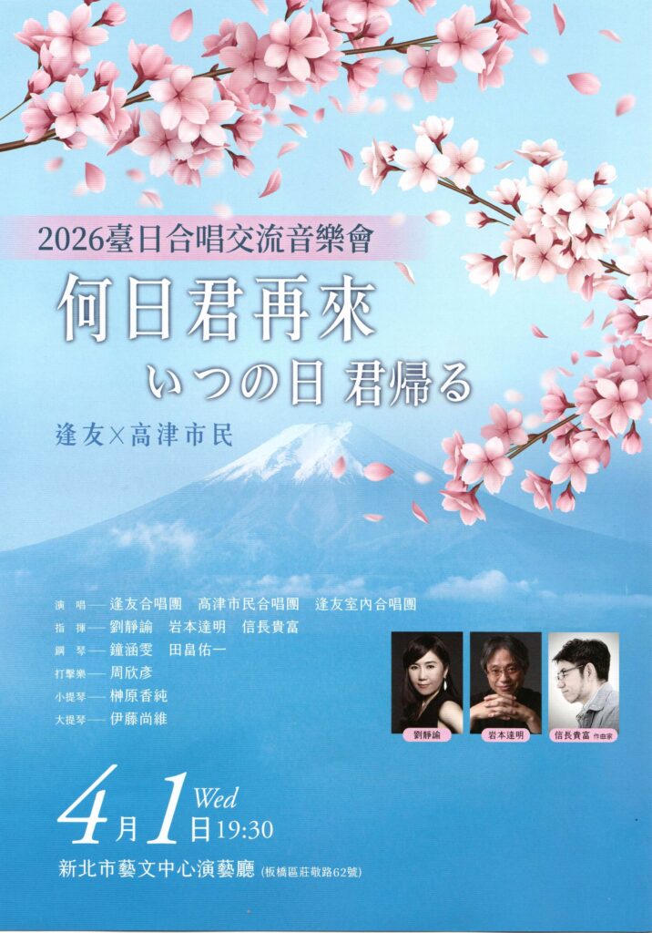 4月1日、台湾新北市芸術センターで、台湾の逢友合唱団との台日合唱交流音楽会がおこなわれました。高津市民合唱団からは約50名が参加。逢友合唱団は昨年6月、新節慶合唱団とともに来日し、素晴らしい歌を披露してくださいました。今回の台湾演奏旅行は、コロナ禍を経て7年越しに実現しました。